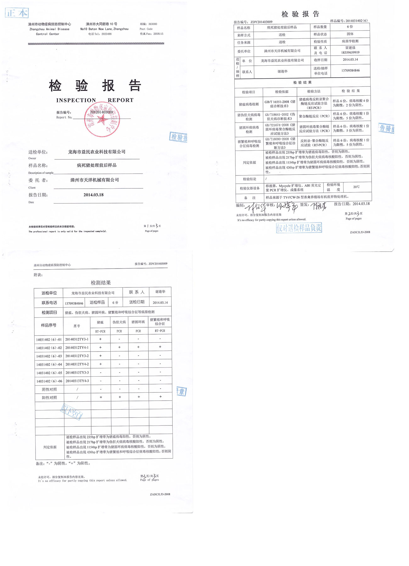 漳州市動物疫病預防控制中心檢驗報告--病死豬處理前后樣本